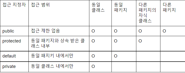 public과 다른점이라면 다른 패키지의 자식 클래스 외부에서는 접근할 수 없다는 것이다.