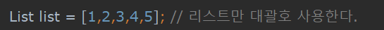 List list = [1,2,3,4,5]; // 리스트만 대괄호 사용한다.