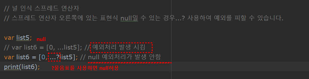 var list6 = [0, ...?list5]; // null 예외처리가 발생 안함
