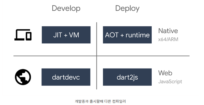 Dart는 이 두 가지 컴파일러를 모두 사용하는 데 적합한 적은 언어 중에 하나이다.